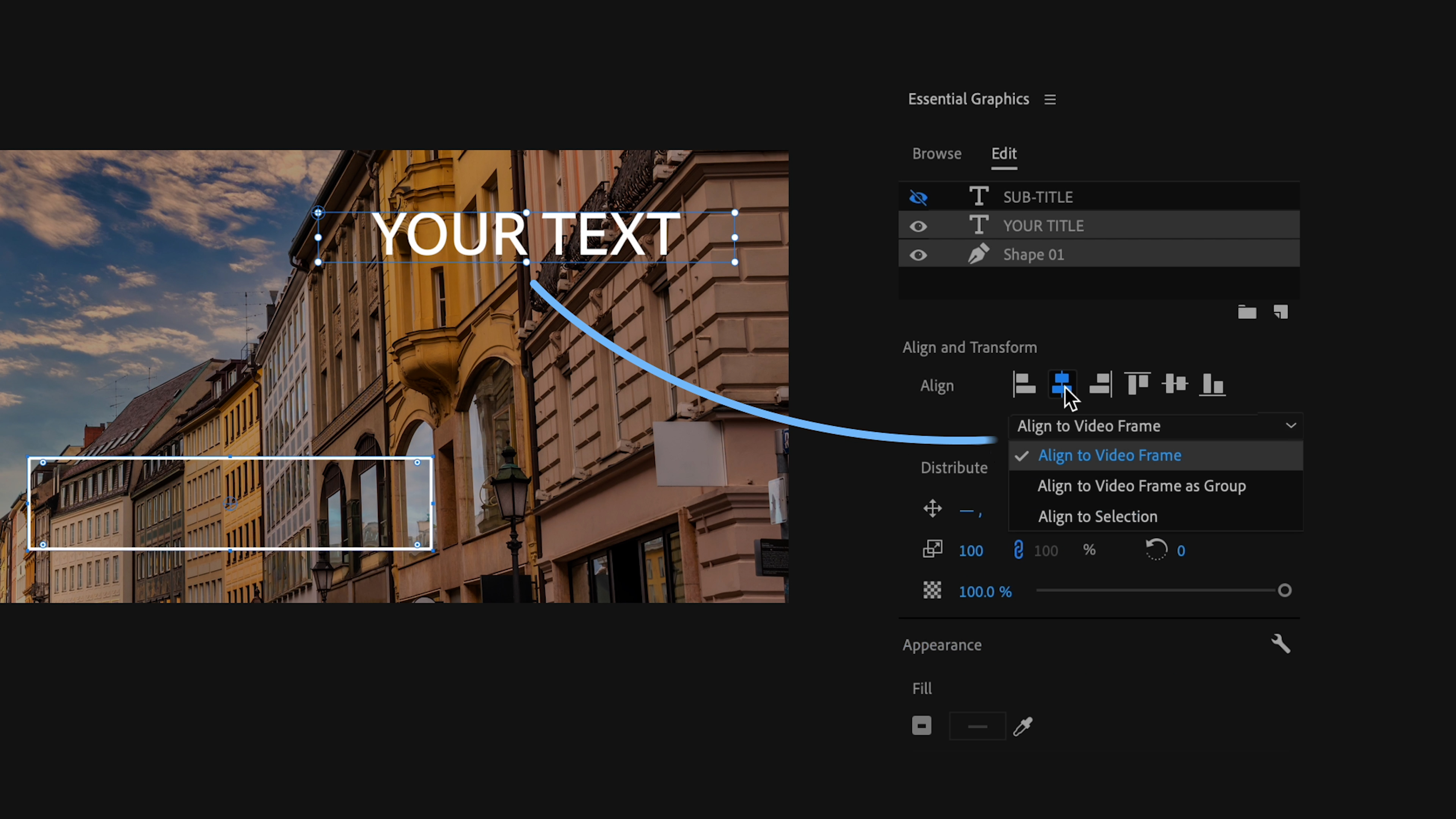 Beim Entwerfen von Titeln im Premiere Pro-Programmmonitor gibt es nun die Möglichkeit Text- und Formelemente mit einem Klick ausrichten. Neben der Möglichkeit, Objekte im Verhältnis zueinander auszurichten, gibt es jetzt auch die Möglichkeit Text- und Formelemente am Videoframe ausrichten.